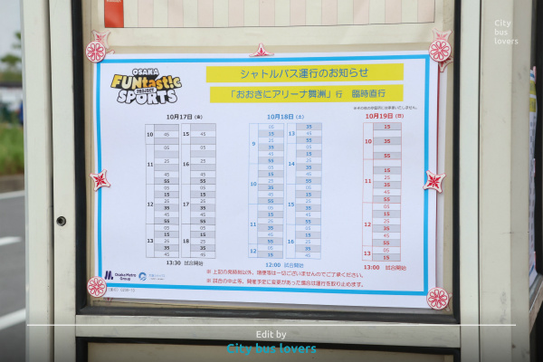 混雑した場所でのバス撮影はお控えください 撮影したバス画像をSNSなどに公開する場合は、運転手や乗客が特定されないよう画像加工をするなどの配慮を行ってください ありがとう 大阪・関西万博 最新の更新情報 2025.01.03 重要なお知らせ 「あきちゃん(の旦那)氏(@NRU_Akichan)による当サイト記事無断転載と当該事案に伴う対策強化のお知らせ」を公開しました 2023.08.13 参加イベント 「GOOD COMIC CITY 31大阪」にサークル参加します 2025.08.01 重要なお知らせ 「『大阪シティバス時刻表』一般頒布再開と今後の即売会参加について」を公開しました 最新のトピックス 2025.10.15特報 大阪・関西万博閉幕 シティバスの来場者輸送もすべて終了 2025.10.31 南河内地区自動運転バス実証実験の開始が延期に 2025.10.28 国土交通省がEVモーターズ・ジャパンに立入検査 2025.10.27 万博シャトルバス発着拠点の解体工事開始を確認 2025.10.27 「第37回なにわ淀川花火大会」に伴う運休・経路変更を実施 2025.10.27 「OSAKA Fantast!c SPORTS MATCH」に伴う臨時直行バスを運行 City Bus Loversからのお知らせ ----.--.-- City Bus Lovers附属ブログ 随時更新中 2025.01.03 重要なお知らせ あきちゃん(の旦那)氏(@NRU_Akichan)による当サイト記事無断転載と当該事案に伴う対策強化のお知らせ 2021.08.01 重要なお知らせ 『大阪シティバス時刻表』一般頒布再開と今後の即売会参加について 2024.12.04 重要なお知らせ 個人運営のサイトへのリンク紹介終了のお知らせ