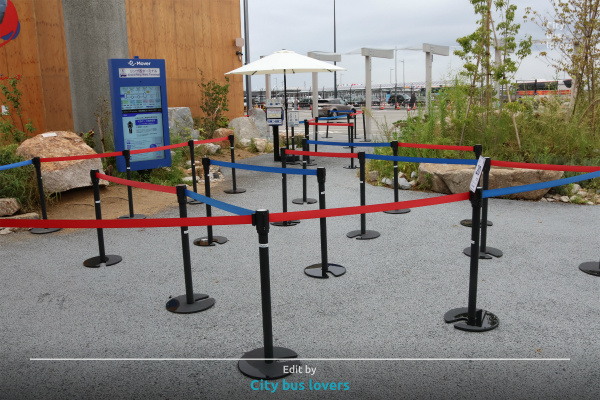 待機列が蛇腹方式に変更された西ゲート北ターミナル停留所。開幕直後から同停留所の混雑がもっとも激しく、1時間以上の待ち時間でも対応できる設計となっている。