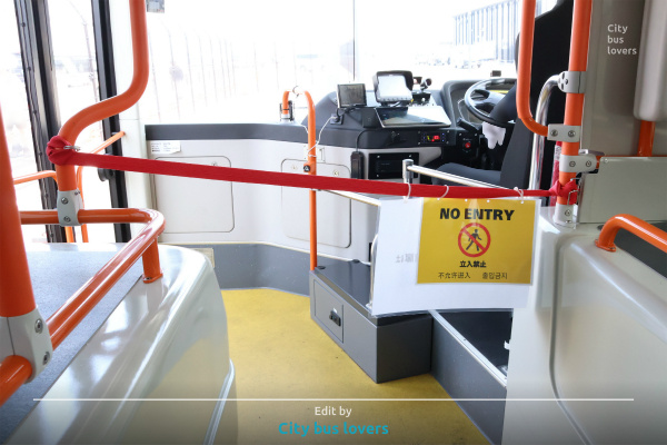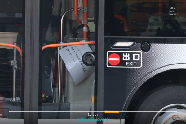 万博駐機場営業所の大型車にも車内前扉封鎖ロープ設置を確認