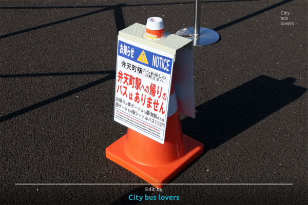 夢洲第1交通Tに設置されたお知らせ。片道のみの設定のため、弁天町方面行きの復路便は設定されていないことを案内する案内が用意されている。