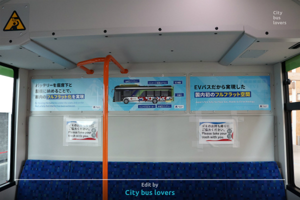車内最後部に掲出されているメトログループ協力のエルガEV紹介広告。新カラーリング車のイラストを使用して車両の説明を行っている。
