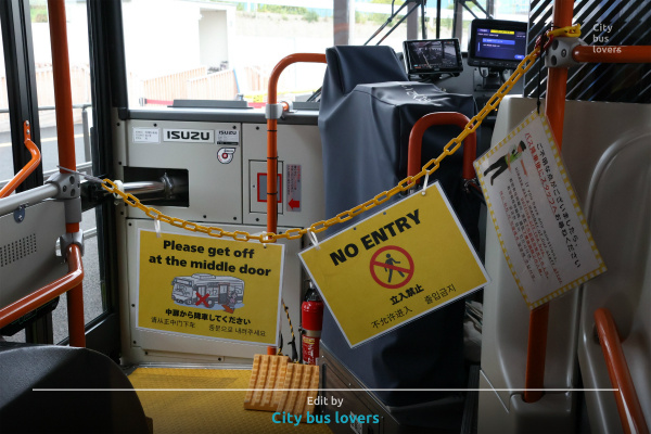 追設されたのは「中扉から降車してください」というイラスト付きの案内で、詳しい追設理由は不明なものの中乗中降という一般路線ではみられないバスでは特殊な乗降方式を乗客に説明するためとみられ、従来から用意されていた立入禁止の案内と同じく日本語・英語・韓国語・中国語の4ヶ国語対応となっている。