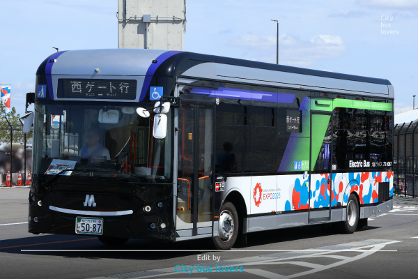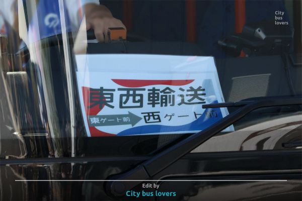 万博会場内外周バス「e Mover(イームーバー)」東西輸送便の前面ボード更新を確認