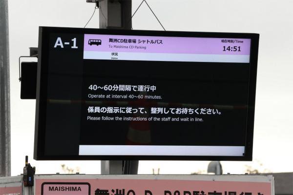 夢洲第1交通Tの大型バスロケモニターに用意されたCD駐車場P&Rシャトルの案内。追加路線であることから表示スペースが確保できず紙による案内追設となった。