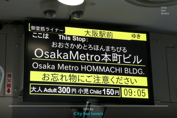 御堂筋ライナーの車内停留所案内表示。表示内容は一般路線のものをおおむね踏襲し、運賃表示の箇所はライナー用の大人・300円、小児・150円に差し替えられている。