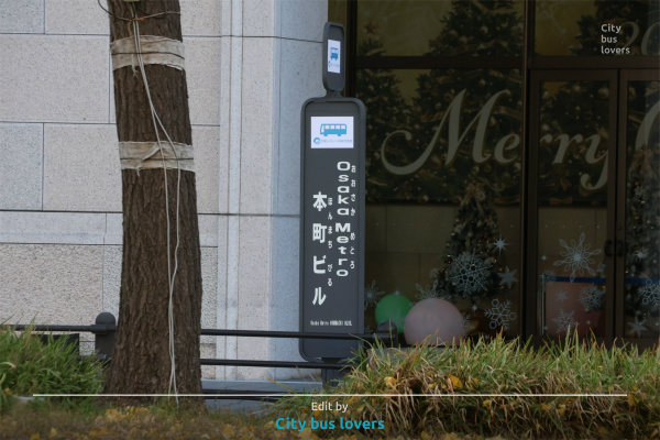 新設されたOsaka Metro本町ビル停留所。同型標柱では初めて黒色を採用しているほか、通常の8号系統は同停留所に停車せずライナー専用の停留所となっている。