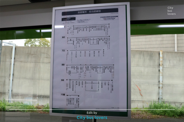 港所属車の車内に掲出された担当路線一覧。通常用意される路線図の作成が間に合わず、社内で使用される運転系統票をもとに作られた横棒型の様式が使用されている。