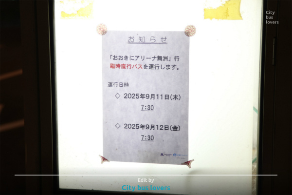 トップページ » トピックス » 2025年7月〜9月のトピックス (クリックするとその月のトピックスにジャンプします) 2025年9月 2025年8月 2025年7月 2025年9月のトピックス 2025.09.30 退場ピーク時間帯の桜島駅万博シャトルバスが完全予約制に移行 2025.09.30 桜島駅前発おおきにアリーナ舞洲行きの臨時直行バスが再び設定 2025.09.30 万博シャトルバス用車両の前扉封鎖ロープに注意書きの案内が追加 2025.09.30 舞洲P&R自動運転バス 9月4日ダイヤ変更 2025.09.30 弁天町駅万博シャトルバスの乗車券発売開始時刻が変更 2025.09.30 弁天町駅万博シャトルバス9月1日ダイヤ変更 始発が15分繰り上げに 2025.09.30 「玩具花火大会」に伴う59号系統の臨時短縮(2025年8月〜9月分) 2025.09.13 クレジットカードなどのタッチ決済用端末取り付けが進行中 2025.09.13 IKEA行バス2025年4月1日ダイヤ変更 2025.09.12 MBSテレビ「ごぶごぶ」で大阪シティバスがロケ協力する新企画が開始 2025.09.12 シティナビゲーター(運転手)募集広告が再展開 2025年8月のトピックス 2025.08.30 天王寺地区中心部の近鉄バスとの競合が一部解消 2025.08.30 大阪・関西万博会場内のいすゞ・エルガEV休憩所用車両が新しい車両に交換 2025.08.27 桜島駅万博シャトルバス8月18日ダイヤ変更 桜島駅BT行きが10本増発 2025.08.27 舞洲P&R万博シャトルバス8月18日ダイヤ変更 入退場ピーク時間帯の運行本数が増加 2025.08.25独自 桜島駅万博シャトルバスの車内放送に急停車注意の案内放送が追加 2025.08.23 BSテレ東「ニッポンを駆けるミライのバス」でシティバスの万博関連輸送が紹介 2025.08.23 人気フットサルチームの試合開催に伴う臨時直行バスが運行 2025.08.22 エヴェッサ応援バス 2025-2026シーズンから試合観戦者の乗車運賃が無料化 2025.08.18 2025年夏の「おでかけキッズパス」連動キーワードラリーが開催中 2025.08.14 メトロ中央線の線路トラブルに伴う駅シャトルバスの緊急運行を実施 2025.08.12 2025年お盆期間の運行ダイヤ 2025.08.12 メトログループ2025年度第1四半期決算 シティバスは万博特需で増収増益 2025.08.12 オンデマンドバスでキャンセル前提の不正予約対策を強化 2025.08.12 弁天町駅万博シャトルバス シティバス非関与で運行開始 2025.08.12 港・万博駐機場営業所間の車両転属 6月以降も発生を確認 2025.08.02独自 万博駐機場営業所の大型車にも車内前扉封鎖ロープ設置を確認 2025.08.02 万博会場内外周バス「e MOVER(イームーバー)」のPR広告がメトロ車内などに登場 2025年7月のトピックス 2025.07.31 「玩具花火大会」に伴う59号系統の臨時短縮(2025年7月分) 2025.07.28 「天神祭」陸渡御・奉納花火に伴う運休・停留所休止 2025年は規模が拡大 2025.07.25 桜島駅万博シャトルバス 多客予想日の退場ピーク時を対象に完全予約制を導入 2025.07.25 大阪・関西万博への校外学習に合わせた貸切バスを運行 2025.07.25 舞洲P&R自動運転バス 7月17日ダイヤ変更 2025.07.25 航空自衛隊万博イベントに伴う一部運休などを実施 2025.07.25 大和川地区祭礼に伴う運休・迂回運行を実施 2025.07.25 シティバス2024年度決算 3億円の最終黒字 2025.07.25 淀川地区で水道管破裂の影響による停留所休止や大幅遅延が発生 2025.07.25 2025年度のシティバス安全報告書が公表 2025.07.25 万博シャトルバス用車両の車内に前扉封鎖ロープが設置 2025.07.25 桜島駅万博シャトルバス7月1日ダイヤ変更 桜島側始発の再繰り上げや増発を実施 2025.07.25特報 万博会場外周バス「e Mover(イームーバー)」7月1日ダイヤ変更 2025.07.25 桜島駅バスターミナル改札のIC入場口表記に変化 2025.07.25 電気バス向けの新カラーリング車両が運行開始 2025.07.25 舞洲P&R自動運転バス 6月25日ダイヤ変更 2025.07.25 大阪・関西万博会場内にシティバスカラーのいすゞ・エルガEVが登場 2025.07.02独自 平日朝のバス車内混雑状況 5月分をもって公表終了か 2025.07.02 OMタクシーの「輸送の安全に関する情報」が初めて公開 « Back